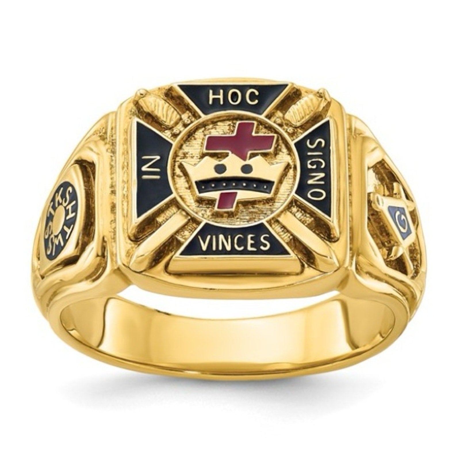 Add a touch of symbolism and sophistication to your wardrobe with the 10k IBGoodman Men's Textured with Enamel Knights Templar Masonic Ring. Made in the UNITED STATES, this men's ring features a unique design inspired by the Templar. Crafted from 10K yellow gold, this ring has a polished and weighs an average of 12.28 GM, making it a substantial and eye-catching piece. The band width 14.3 mm adds to the bold and masculine look of this ring, while the intricate textured detailing and enamel accents give it a touch of elegance.