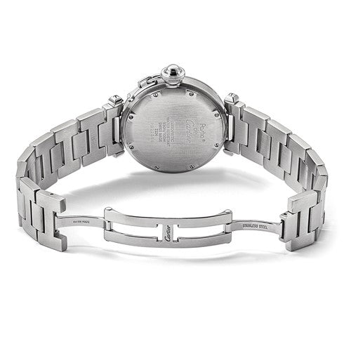 Certified Pre-Owned Cartier Unisex Pasha C Automatic GMT Watch features a white dial with date, 35mm stainless steel case and bracelet, Arabic numerals with gold stone indexes and luminous hands, 24-hour fixed GMT bezel with indicator, and Swiss made automatic movement.