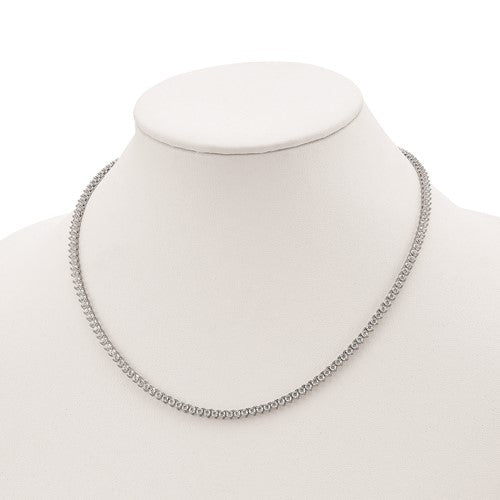 Sterling Shimmer Collection presents a .925 Sterling Silver CZ Riviera Tennis Necklace. The necklace is 18 inches long and 3mm wide. There are 146 cubic zirconia stones in a three prong setting. Each round cz is 2.5mm. The total cz weight is 8.75 carats. The necklace is secured with a slide insert box clasp.