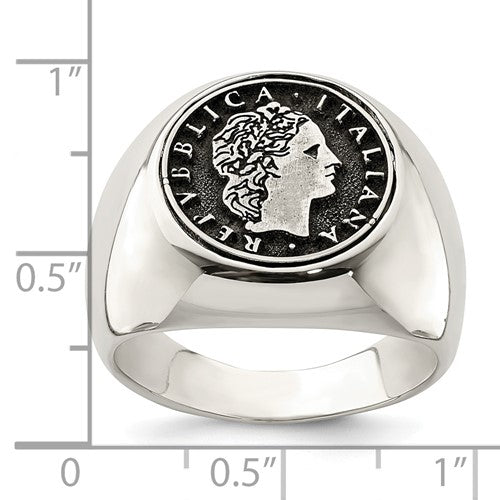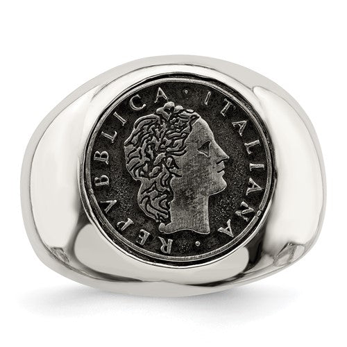 Sterling Silver Polished with Antiqued Replica 50 Lire Italian Coin Ring