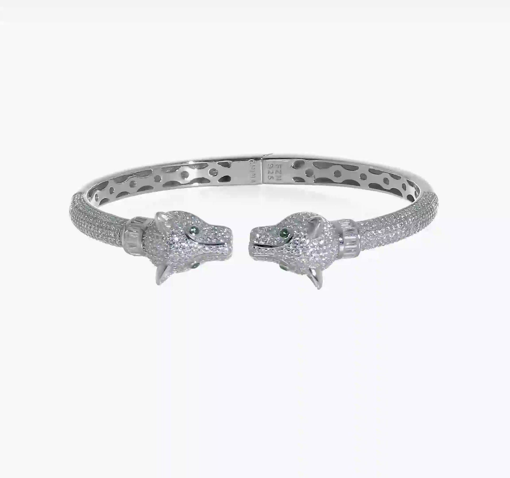 **Sterling Silver Rhodium-Plated CZ Lioness Hinged Cuff Bangle – Bold & Elegant**