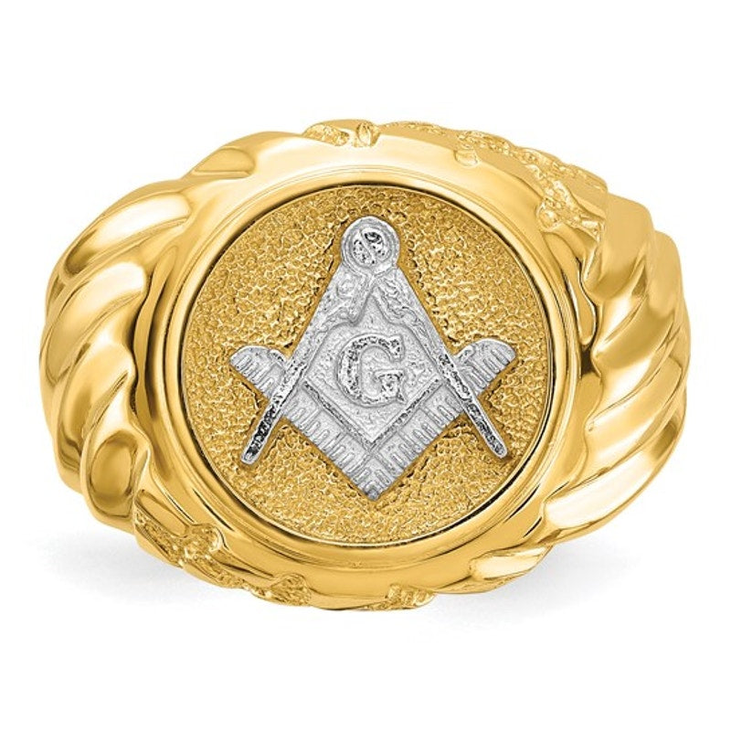 Upgrade your jewelry collection with this distinguished 10k Two-Tone Men's Polished and Textured Masonic Ring—an emblem of excellence and refined style. Crafted in the United States, this ring combines both aesthetic appeal and symbolic significance, making it a perfect choice for any modern gentleman.