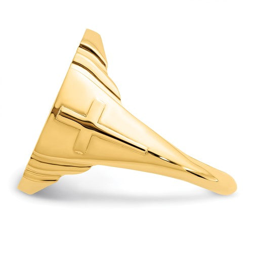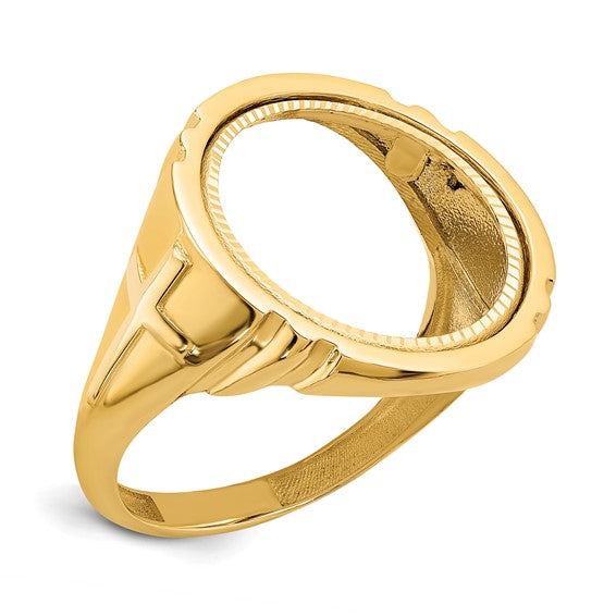 Handsomely crafted man's liberty coin ring. This 14k gold ring has a cross on both sides of the ring. The coin holder is diamond cut with a prong setting.The ring holds a 1/10th oz 22k Liberty coin. Ring size 10. The ring is 14k gold. The ring is manufactured by Wideband.