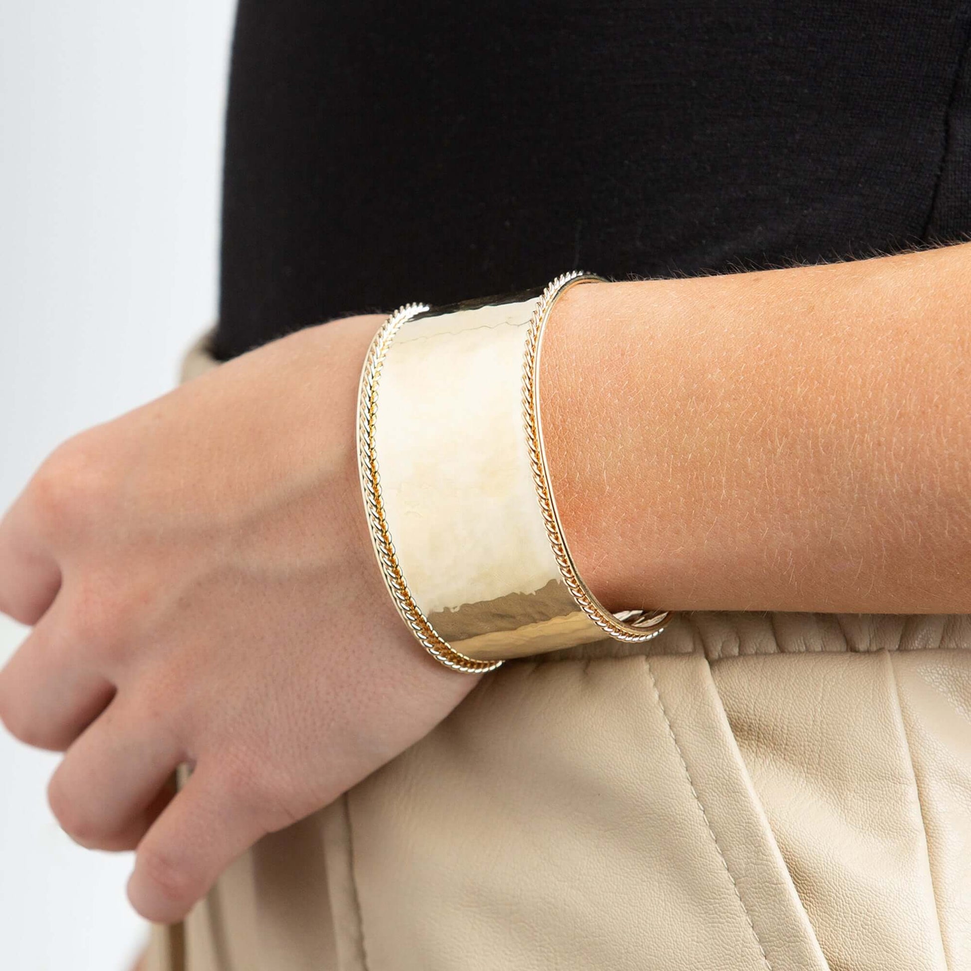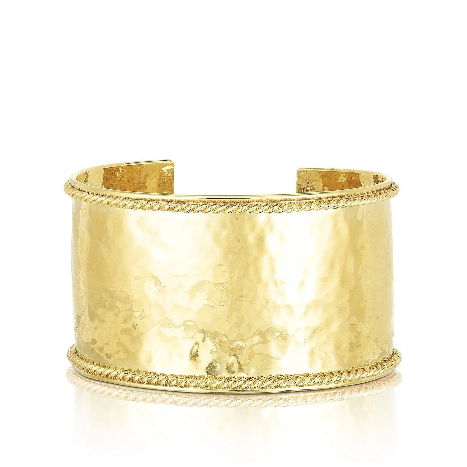 Each piece in the Italian Cable Collection features the elegant twisted cable element throughout the design, inspired by the iconic twists found in every day Italian life. Our Lucia hammered cuff bangle set in 14K yellow gold has a very posh look. From Sunday brunches to formal wear, make a statement with this textured gold cuff. 32mm wide.