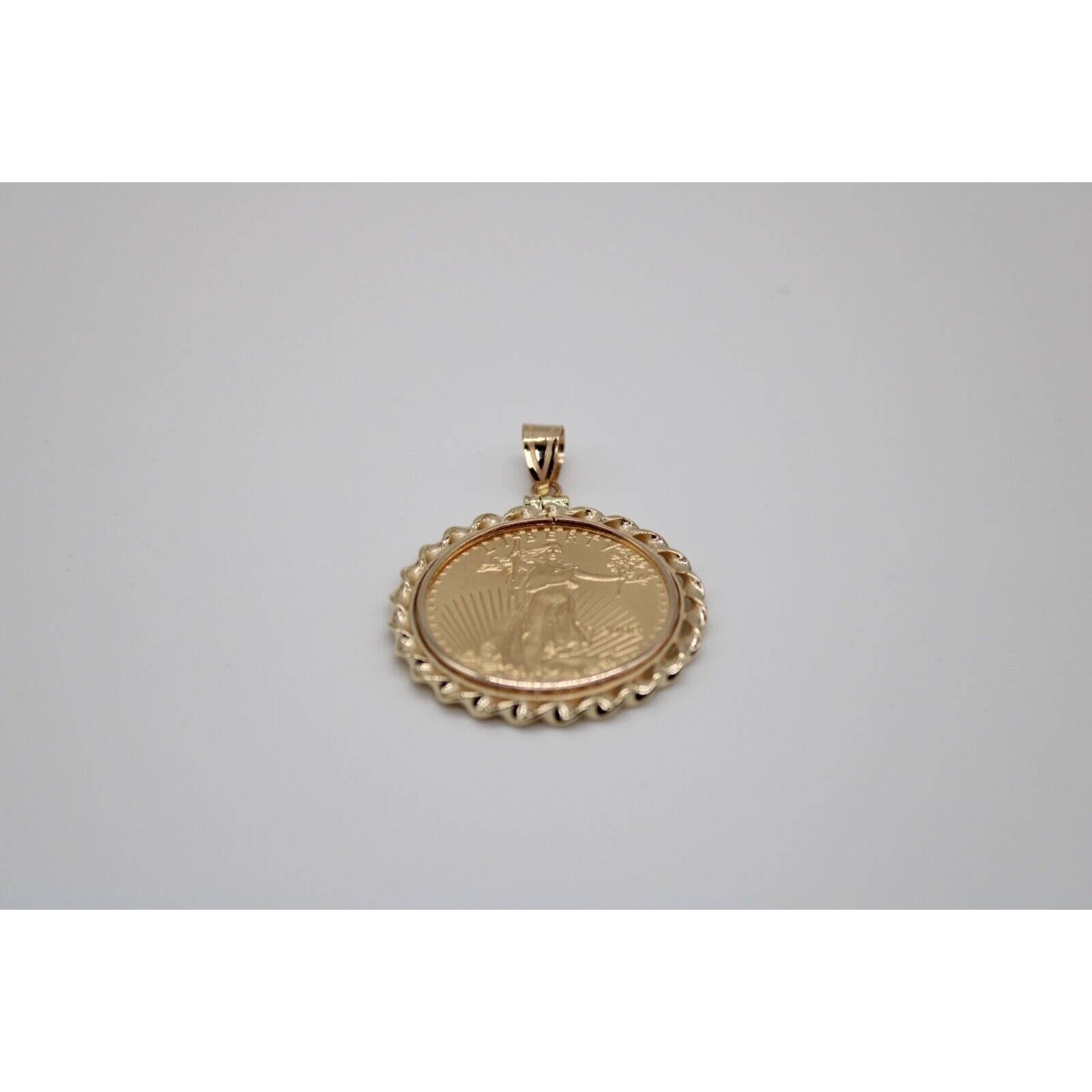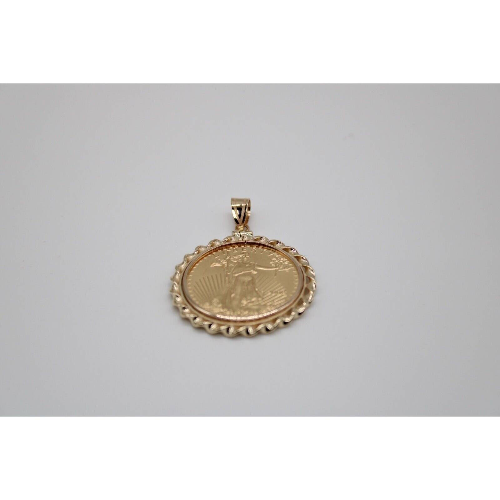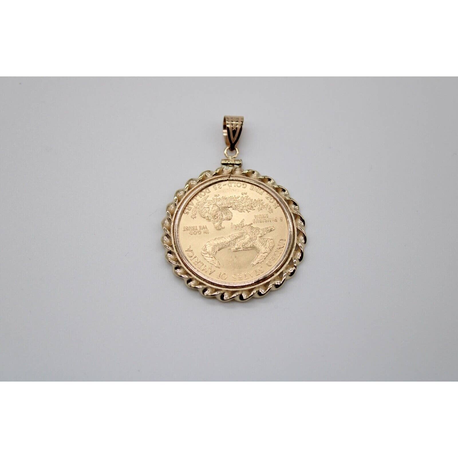 Solid 22k American Eagle 1/2 ounce gold coin with lady liberty on front and four eagles on back. The coin is set in a 14k gold twisted wire polished screw top bezel. The year on the coin will vary based on inventory at time of sale.