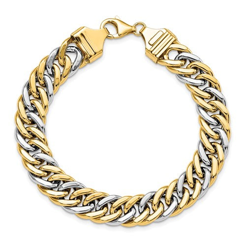 Men's 14k gold two-tone 8 inch curb link bracelet is 10.4mm wide and weighs 14.54 grams. Made in Italy.