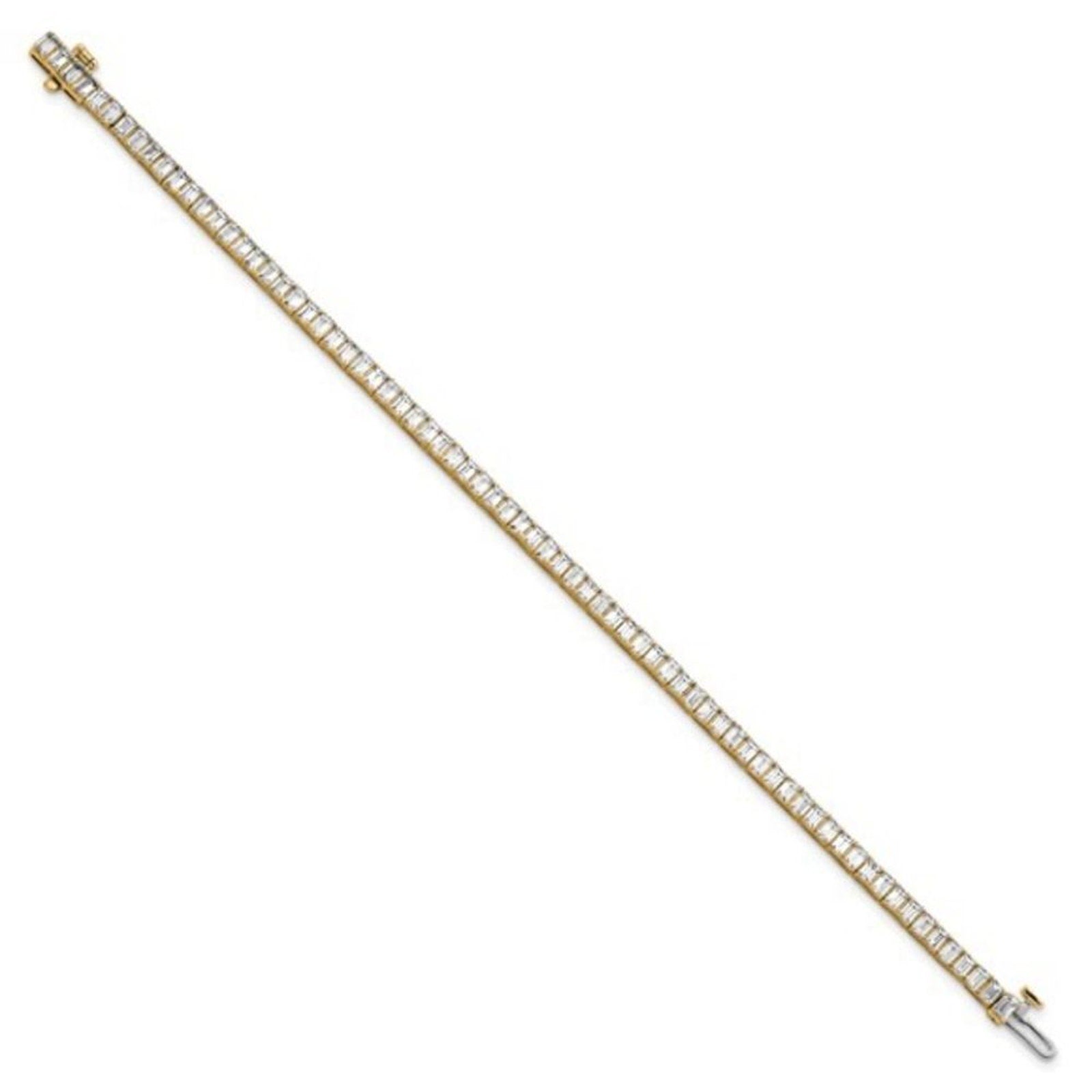 Dazzle with sophistication in this 14K Yellow Gold Lab-Grown Diamond Tennis Bracelet. Featuring an impressive 7.014 carats of lab-grown diamonds, each stone is emerald-cut and bezel set, offering a sleek modern design with superior brilliance.