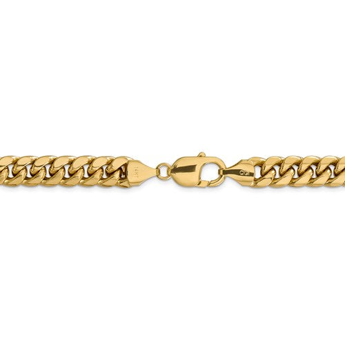 14k Yellow Gold Miami Cuban link chain is 9.3mm wide and 24 inches long. The Miami Cuban link chain is secured with a lobster claw clasp.
