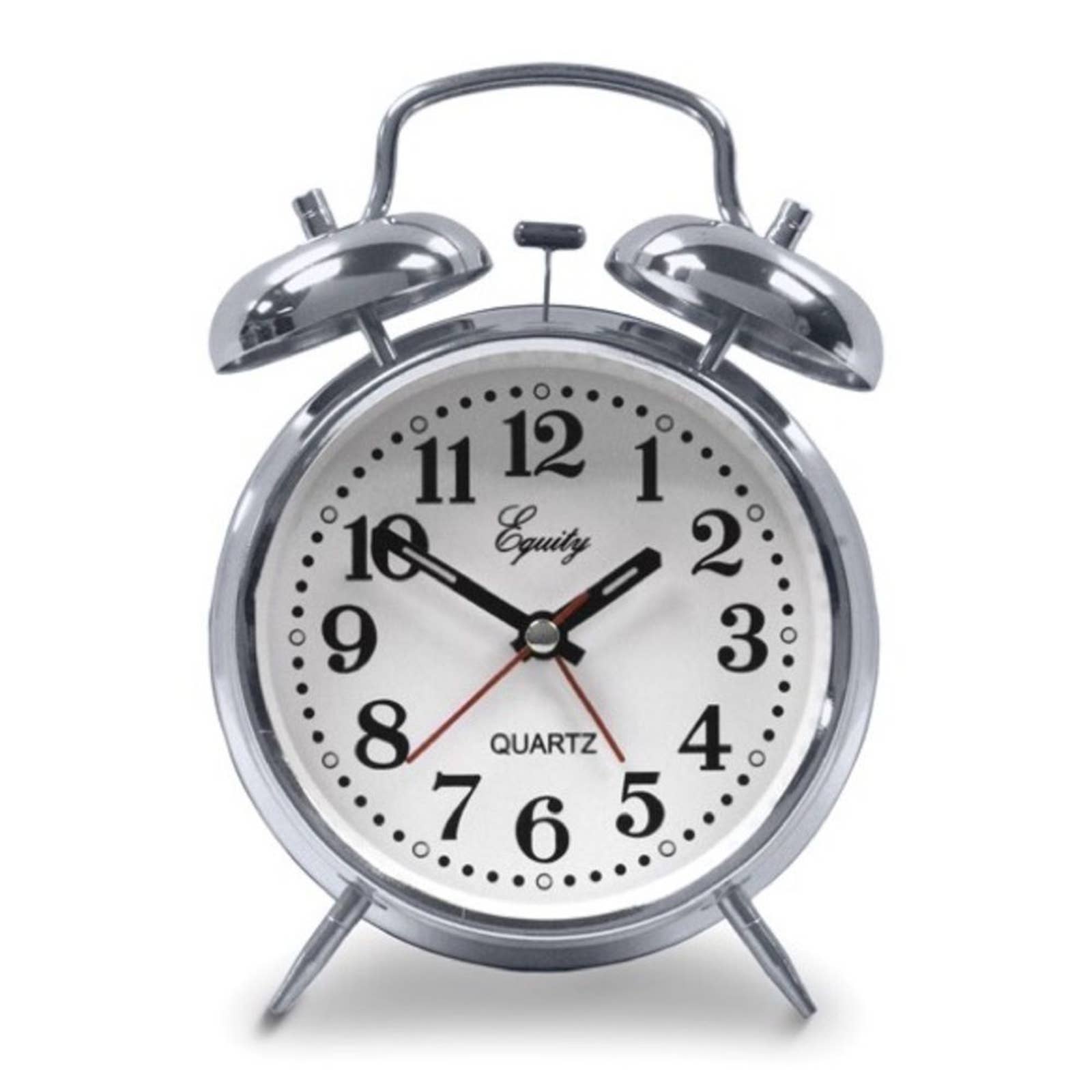 Brand new silver-tone Keywind Twin Bell Alarm Clock measures 4.45 inches long x 2.5 inches wide x 6.25 inches high. Comes with manufacturers warranty.