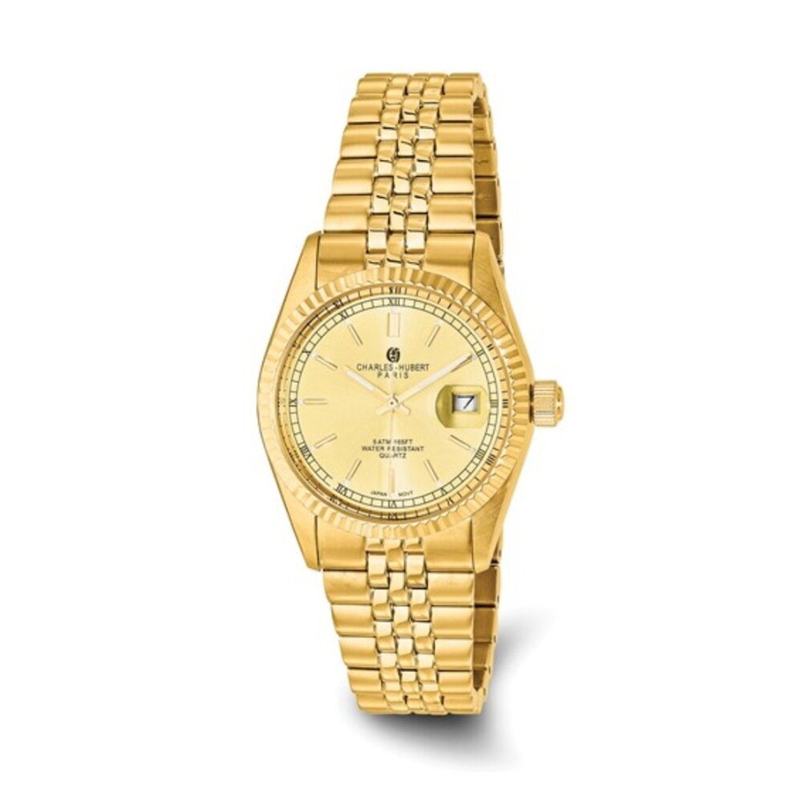 Exude confidence and classic style with this stunning Charles Hubert men’s wristwatch. This timepiece features a full gold-tone aesthetic, from the radiant dial to the polished bracelet, offering a high-end look that transitions perfectly from the boardroom to a formal dinner.