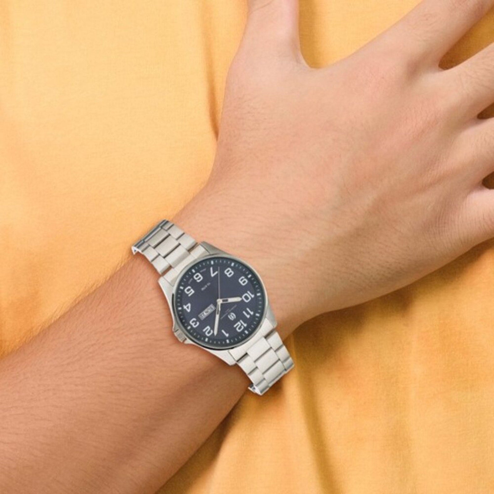 Dial: Beautiful blue face with easy-to-read Arabic Numerals and sleek silver-tone hands.