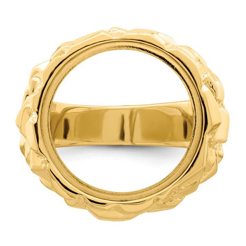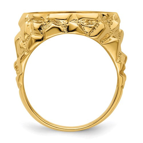 Handsomely crafted man's liberty coin ring. This 14k gold ring has a nugget design. The coin holder has a polished bezel with a prong setting.The ring holds a 1/10th oz 22k Liberty coin. Ring size 10. The ring can be sized from an 8 to 12 which includes 1/4 sizes. ring is 14k gold. The ring is manufactured by Wideband.