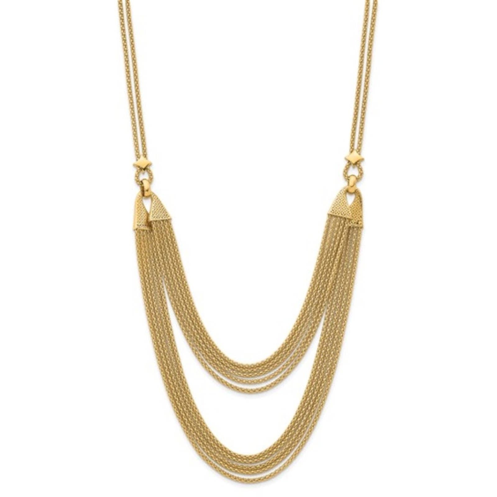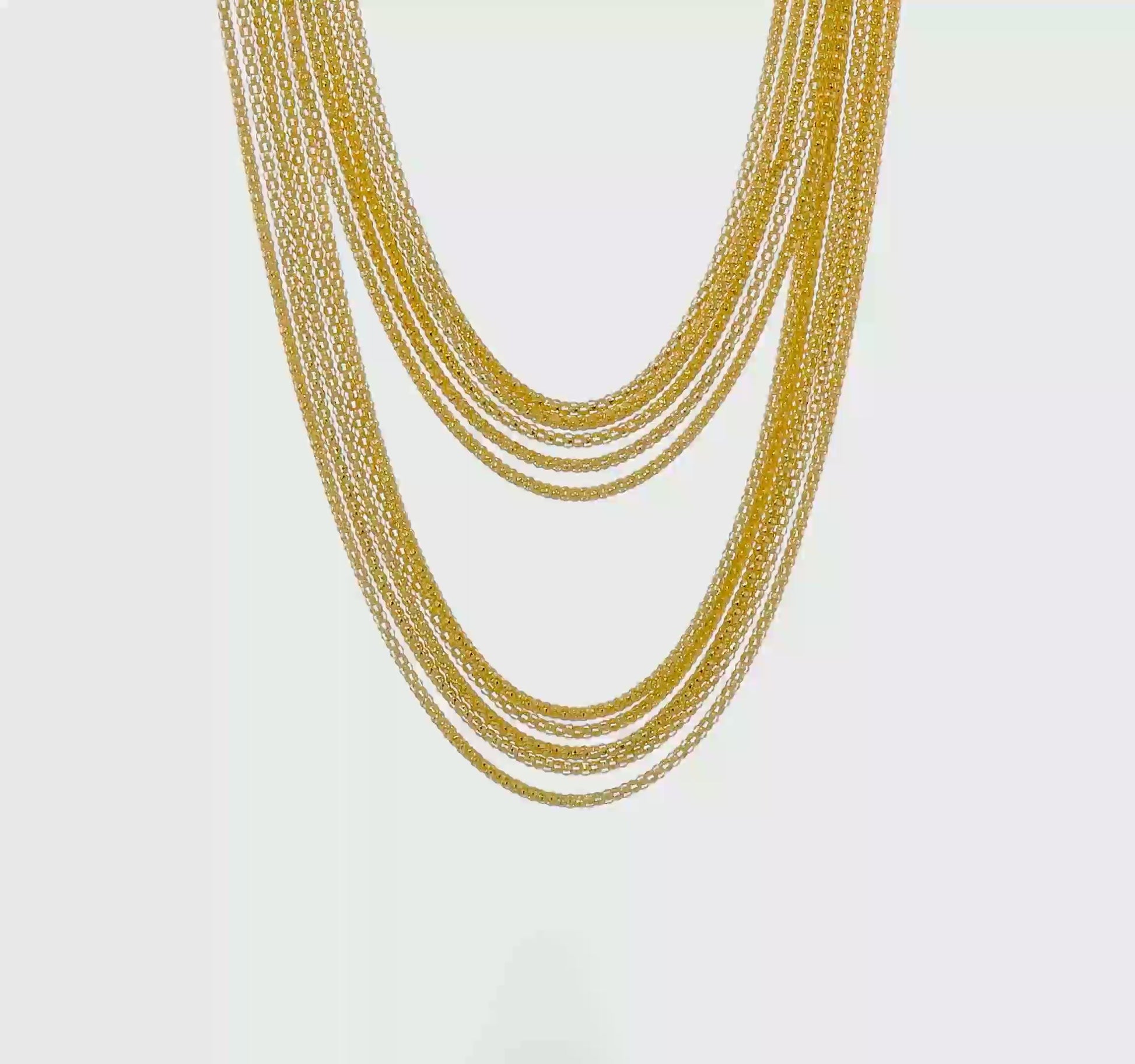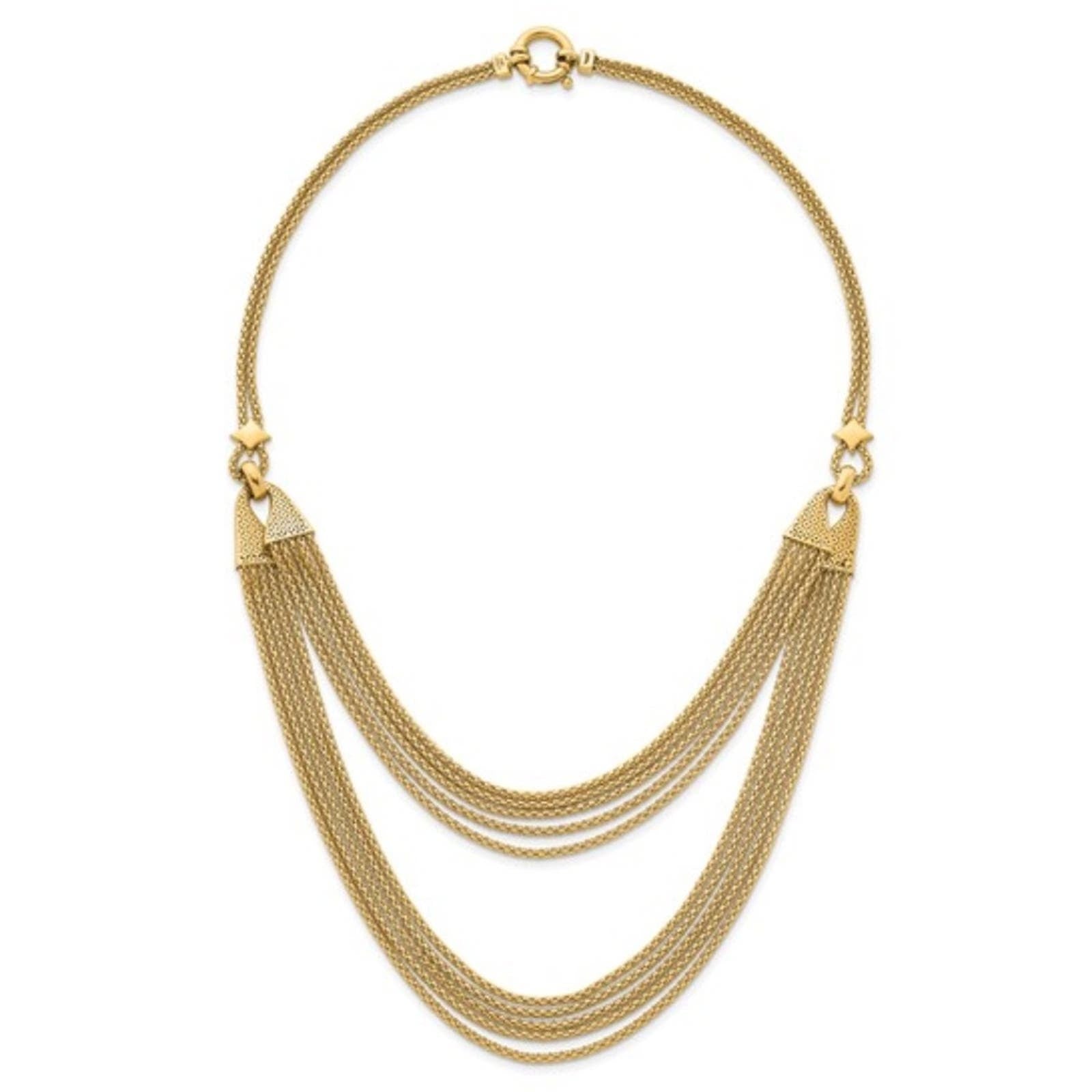 Elevate your look with the elegance of the Herco 14K Yellow Gold Fancy Multi-Strand Popcorn Chain Necklace. Handcrafted in Italy, this necklace features multiple interwoven strands of popcorn-style links that create a bold yet refined 18mm wide silhouette.