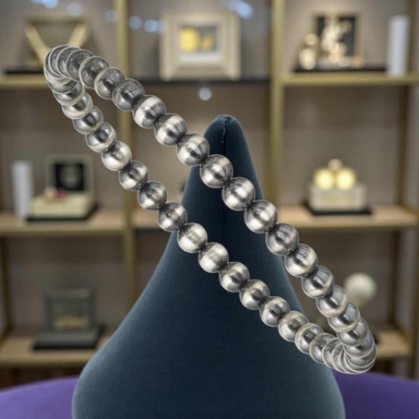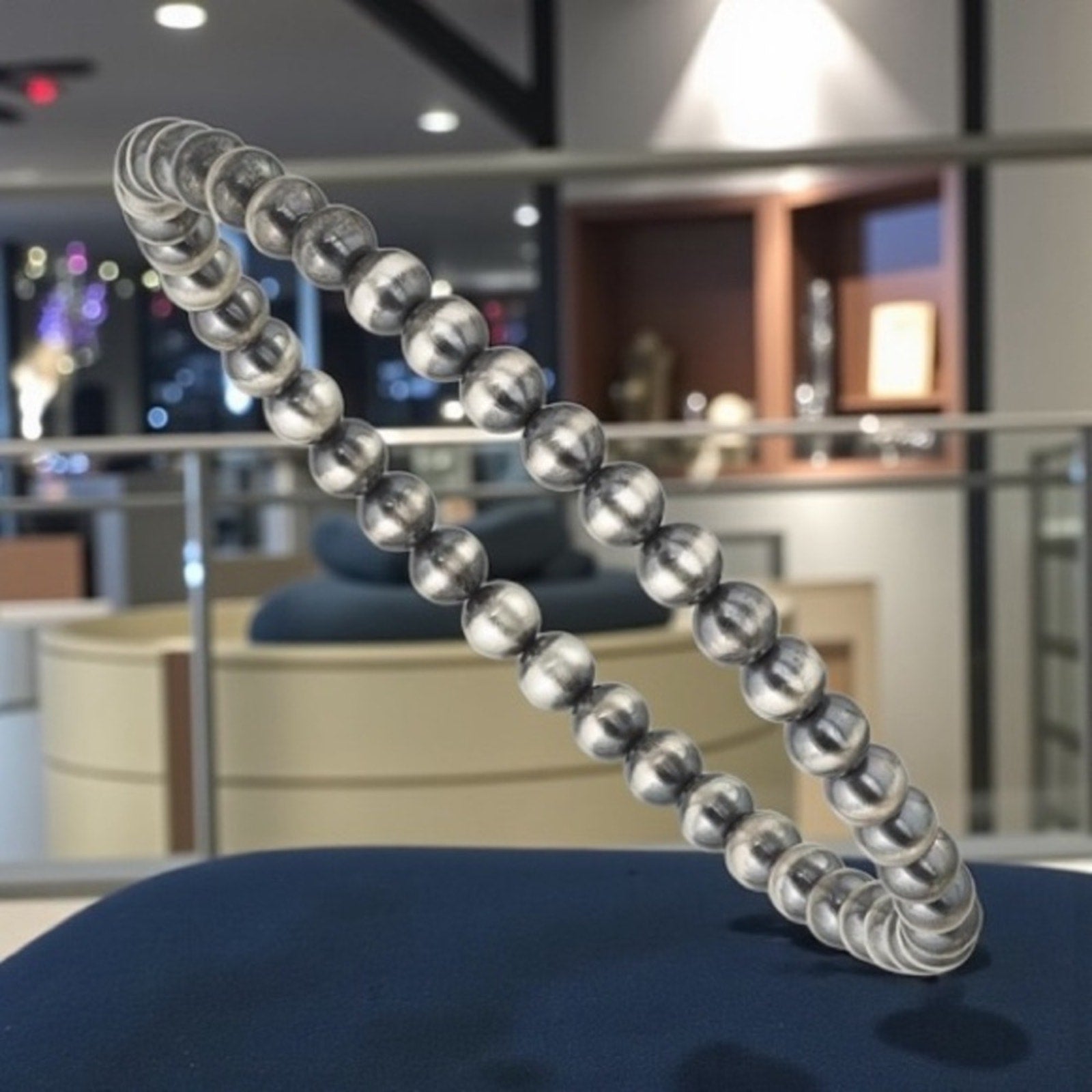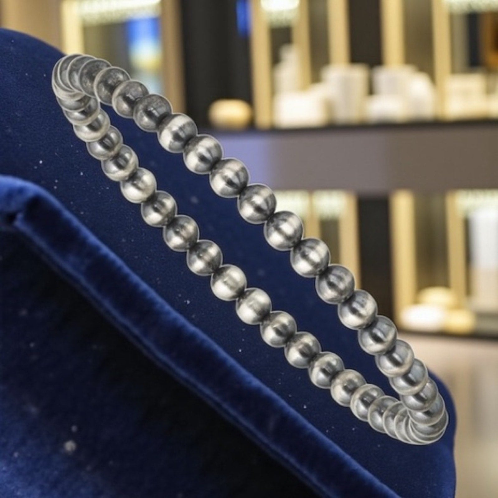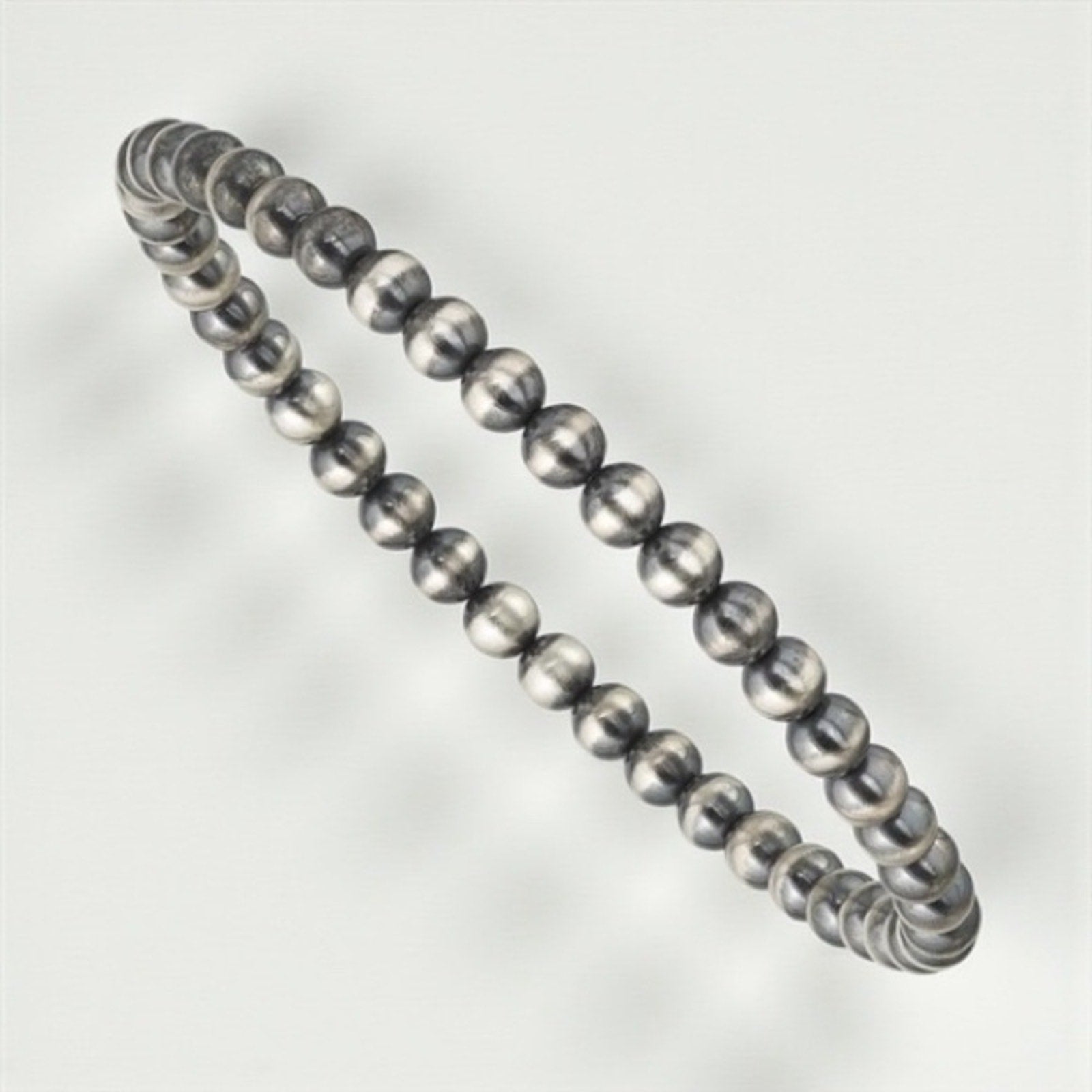 Add a touch of timeless Southwestern charm to your jewelry collection with this Sterling Silver Navajo-Style Beaded Stretch Bracelet. Expertly crafted from .925 sterling silver, this elegant piece features 4mm polished silver beads arranged in a classic Navajo-inspired design.
