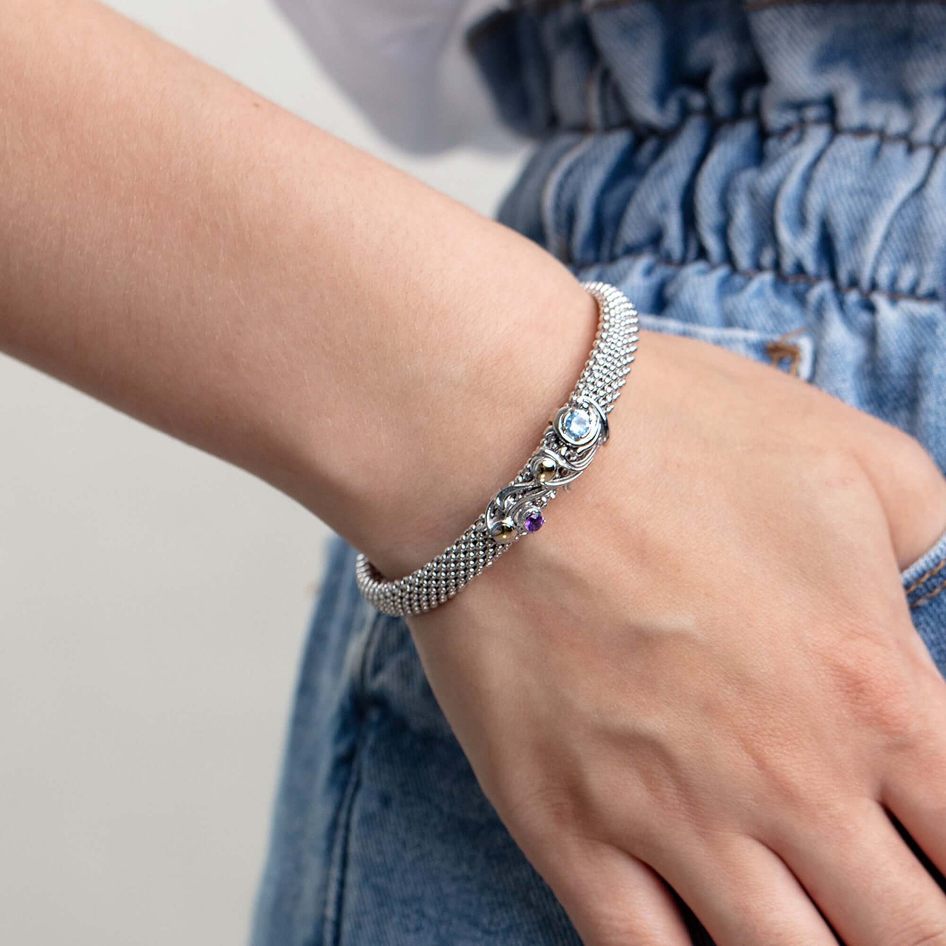 Crafted in sterling silver with 18K yellow gold accents, the bracelet features vibrant blue topaz and amethystgemstones, adding a refined burst of color. Its flexible open cuff design allows for easy wear and fits most wrist sizes comfortably (7–8 inches).