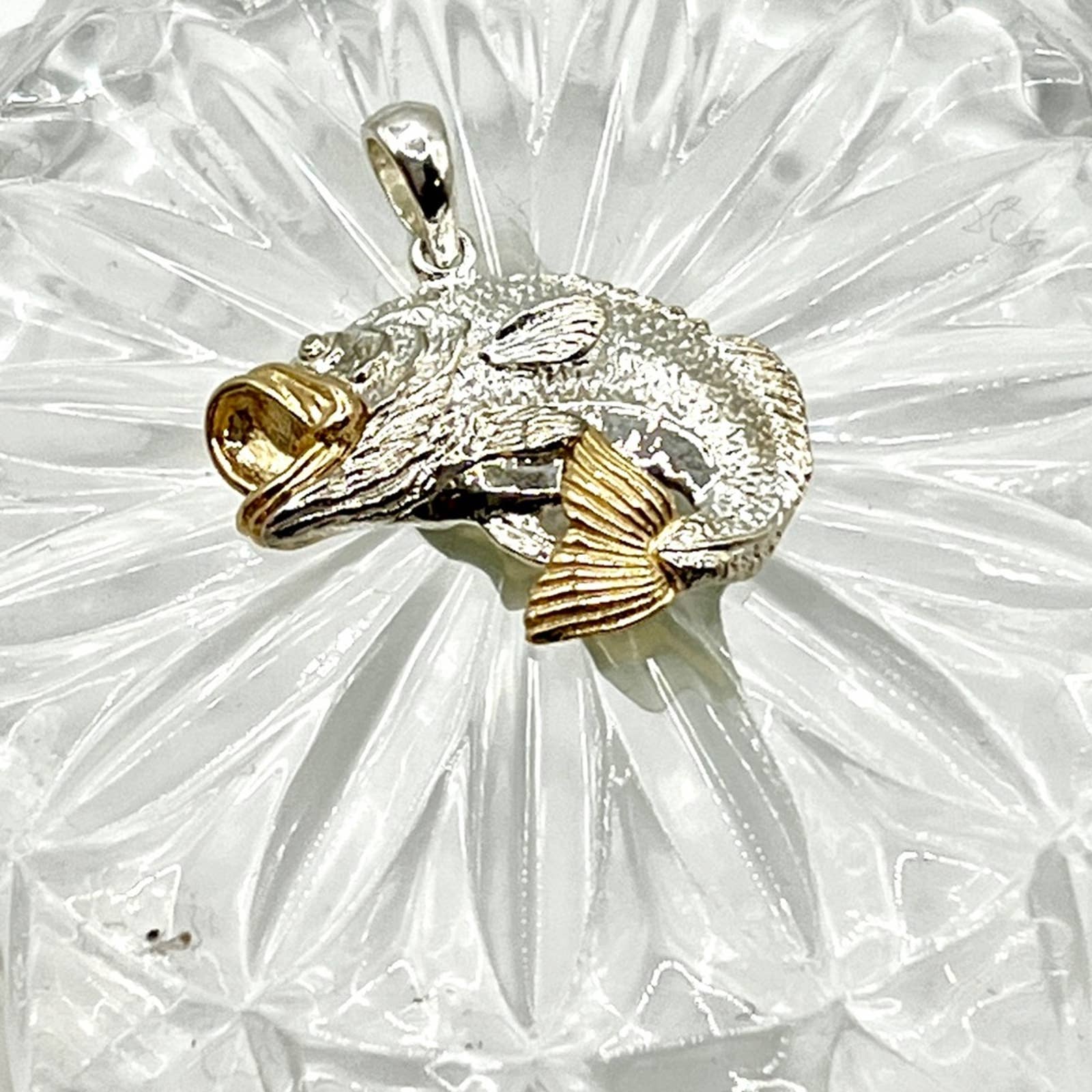 Brand new Sterling Silver Polished Jumping Bass with 14k Accents Pendant. This makes a great gift for the fisherman in your life. This Bass Fish charm measures 28mm long by 25mm wide.