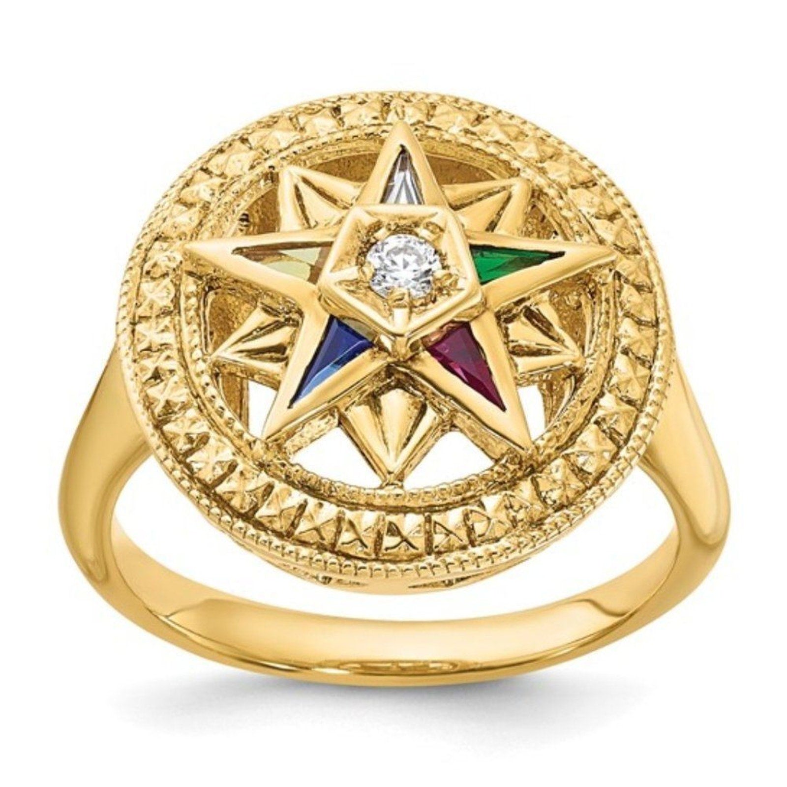 14k Women's Polished and Text Eastern Star Masonic Ring. This stunning 14k yellow gold Masonic ring is the perfect accessory for any Eastern Star member. The polished and textured design adds a touch of elegance and sophistication to any outfit. Made in the United States with high-quality materials, this ring is sure to make a statement wherever you go. With an average weight of 5.15 GM and a gem weight of 0.15, this ring is both stylish and comfortable to wear. Treat yourself or a loved one to this beautiful piece of jewelry today!