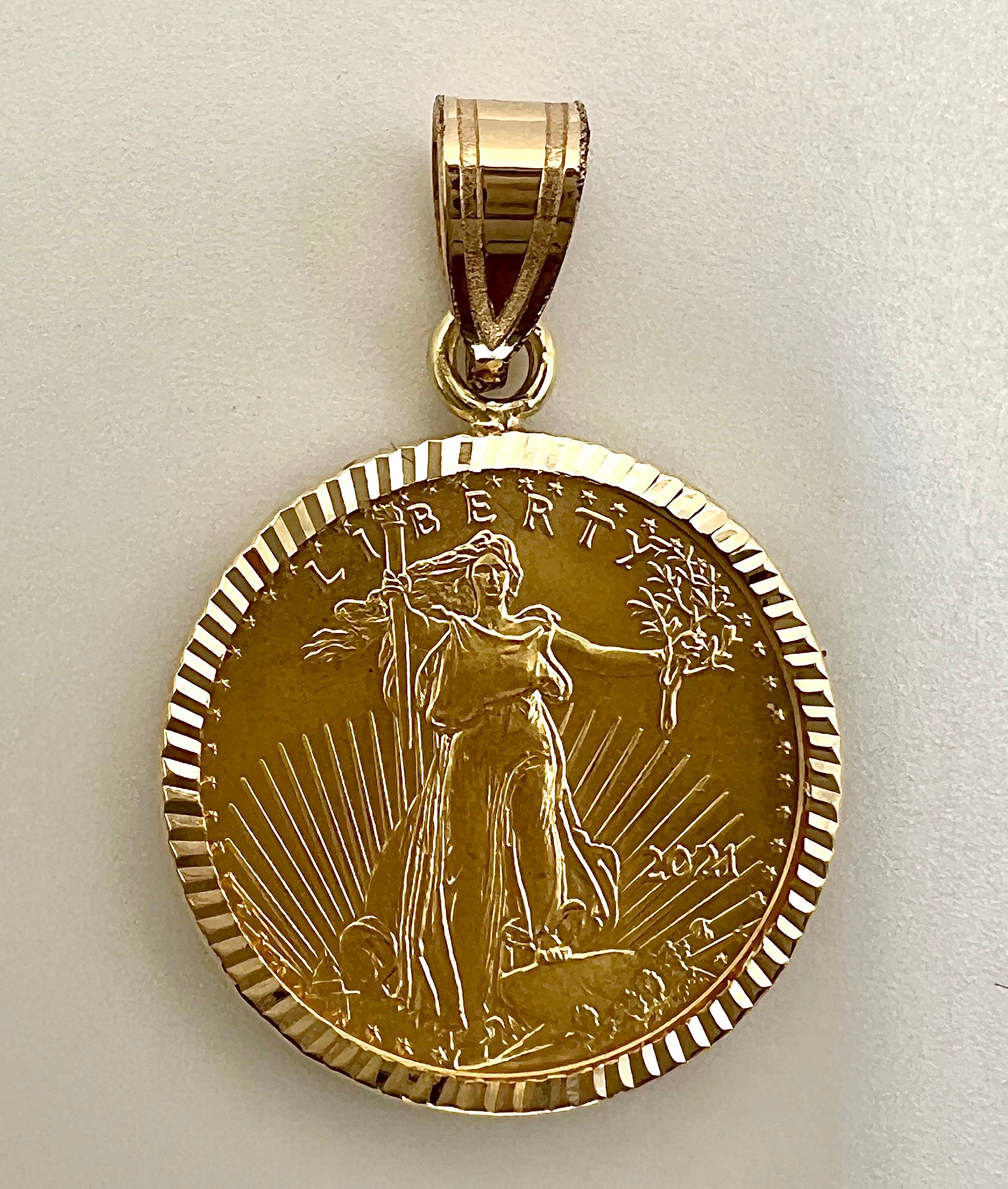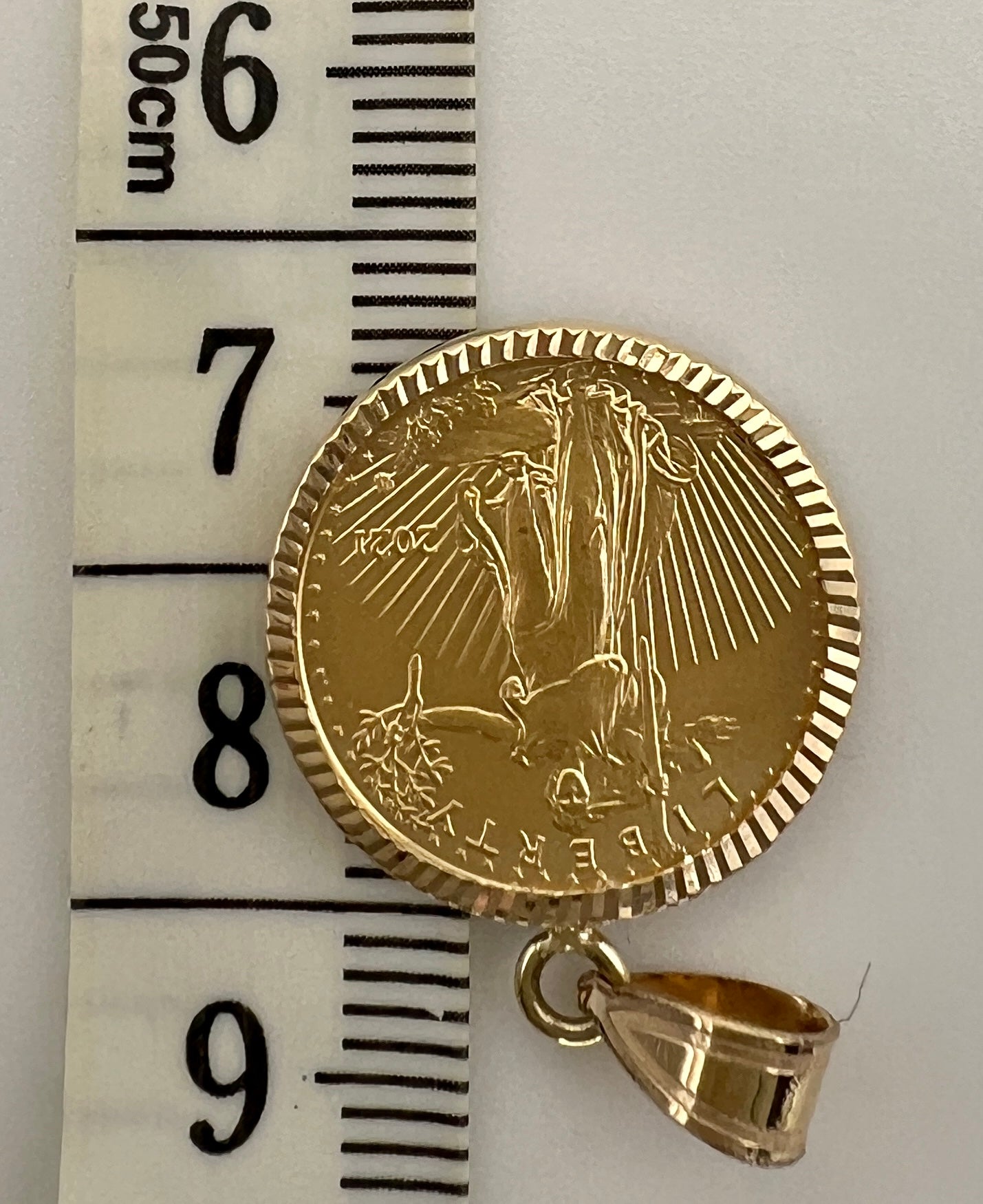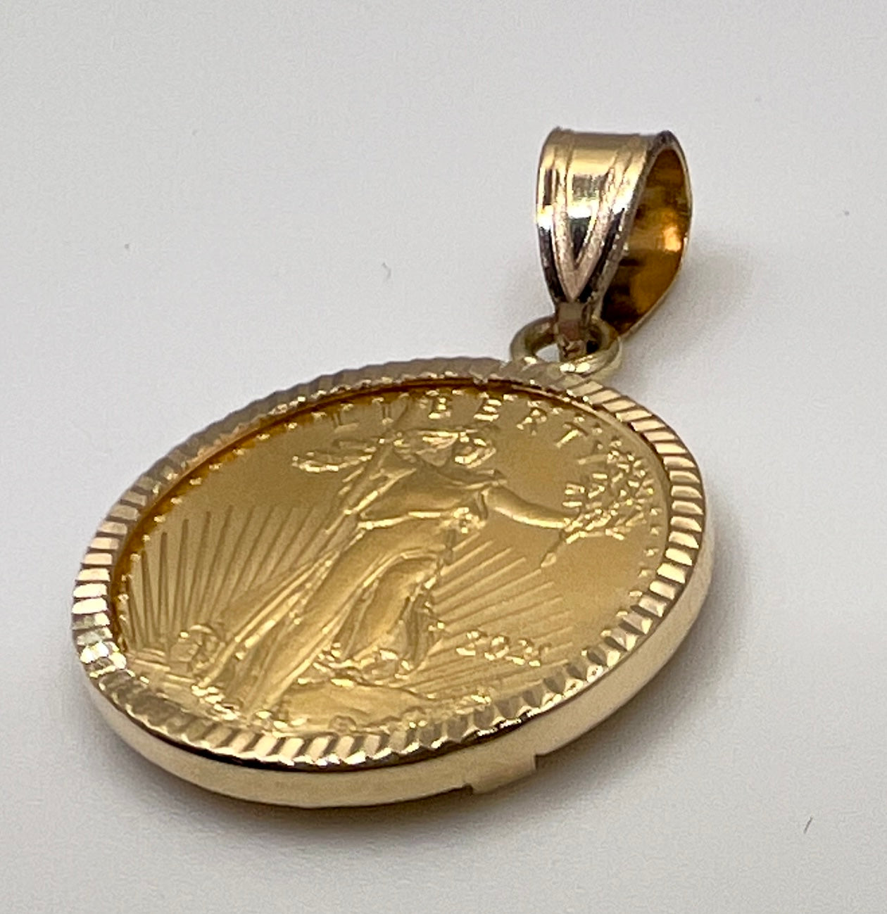 This listing is for brand new 14k gold diamond cut prong mounted 1/10th ounce Lady Liberty coin. The year on the coin will vary between 2021 and 2023 dependent on inventory.