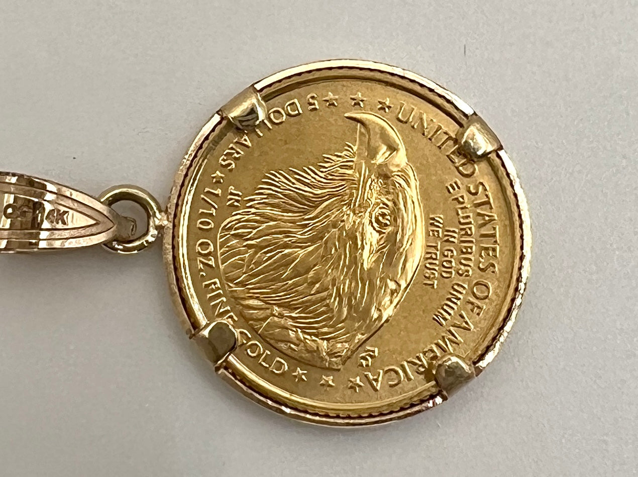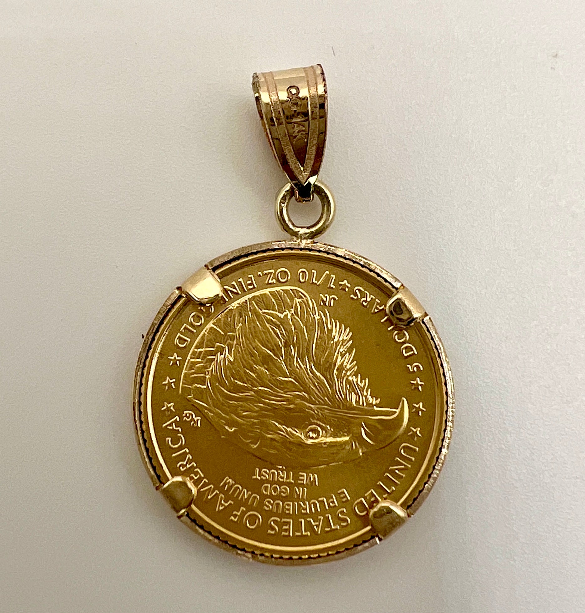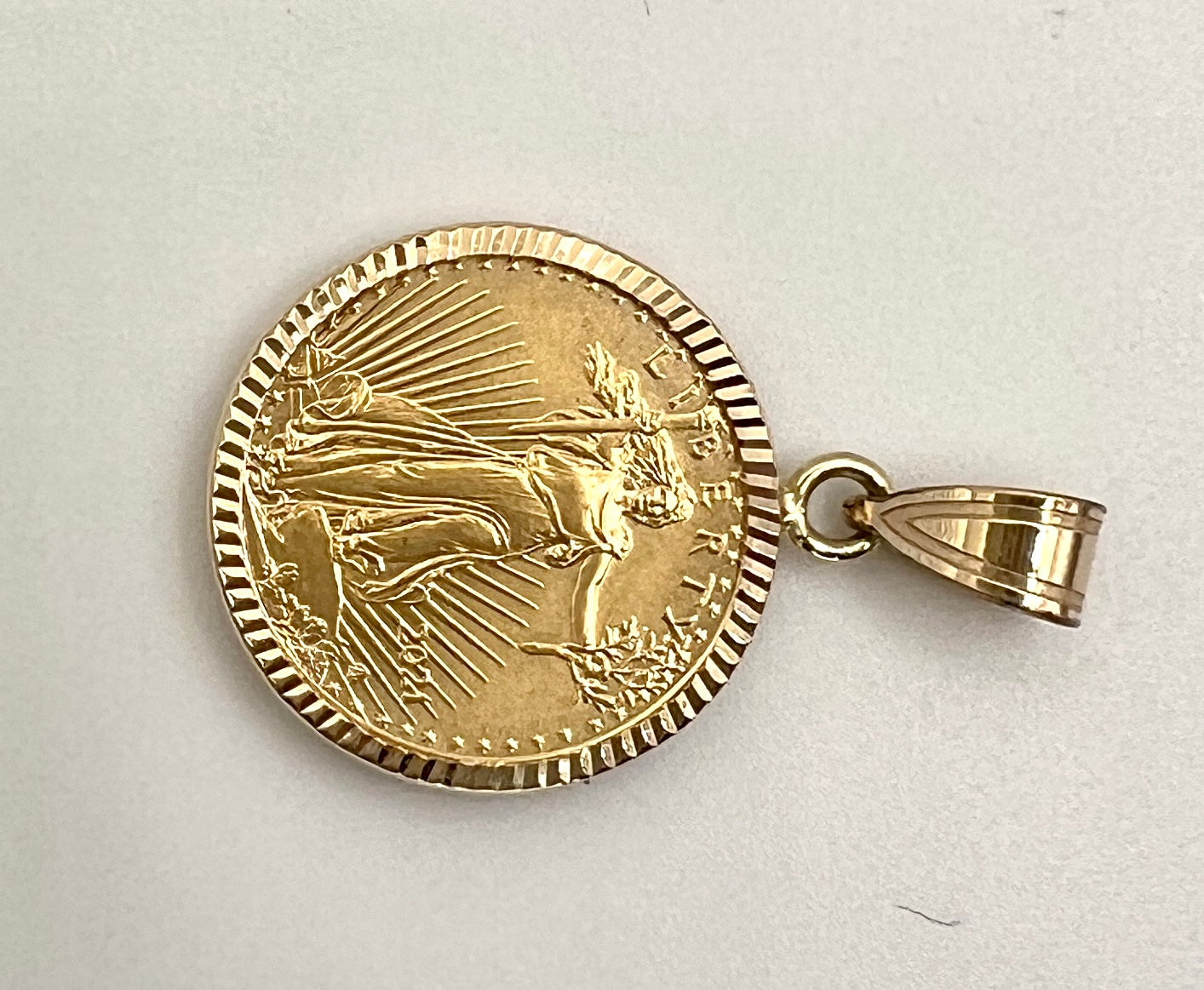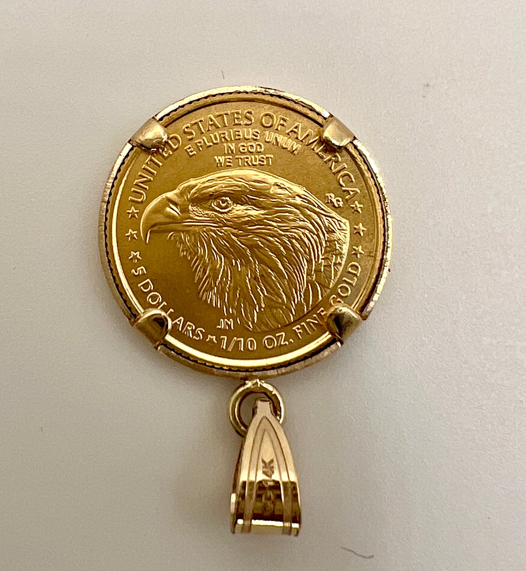 This listing is for brand new 14k gold diamond cut prong mounted 1/10th ounce Lady Liberty coin. The year on the coin will vary between 2021 and 2023 dependent on inventory.