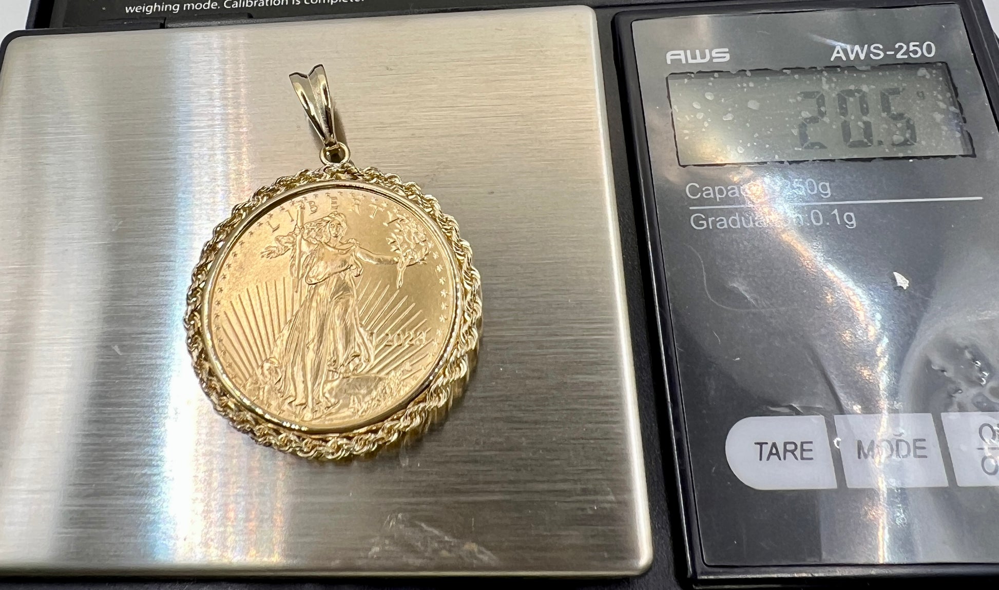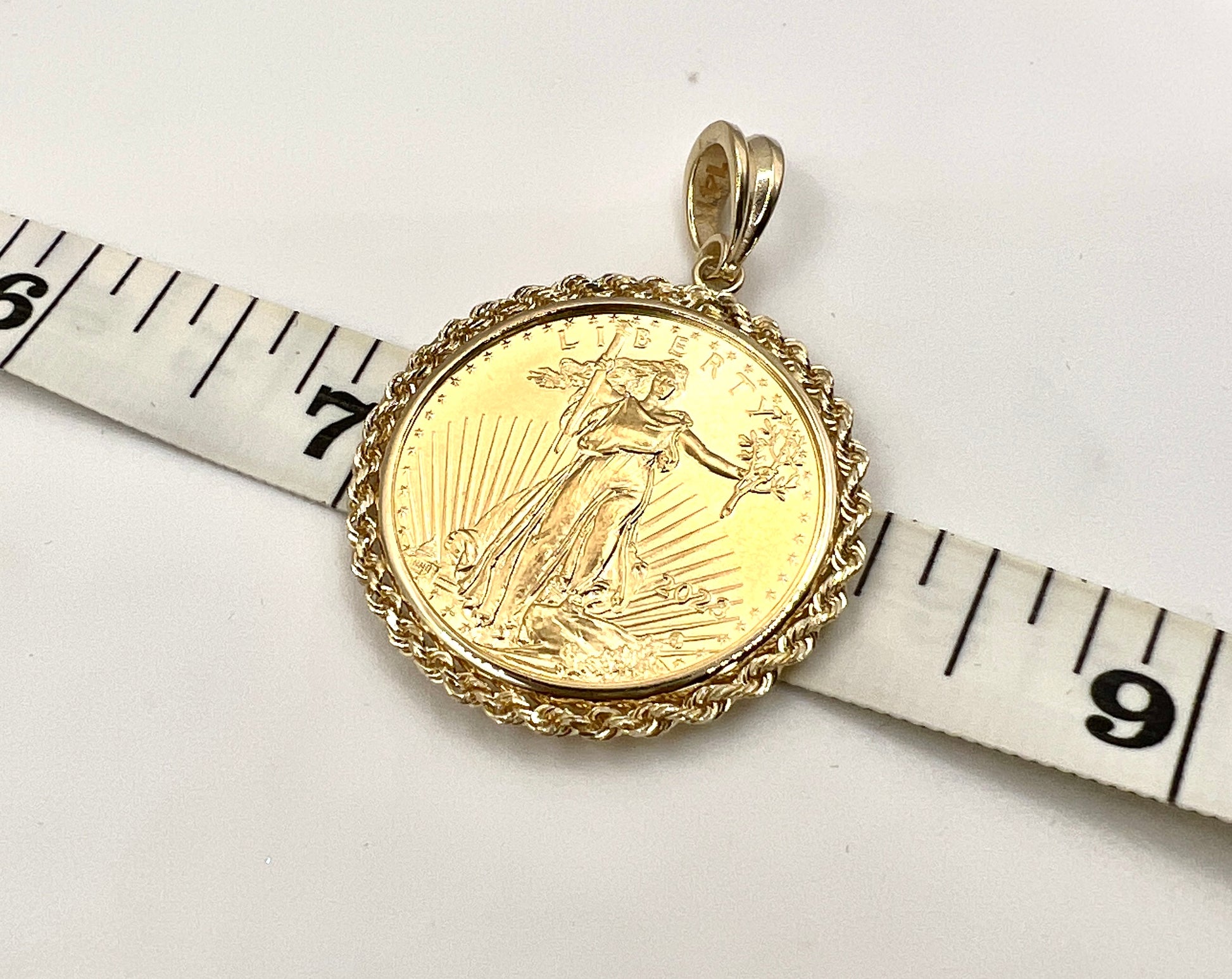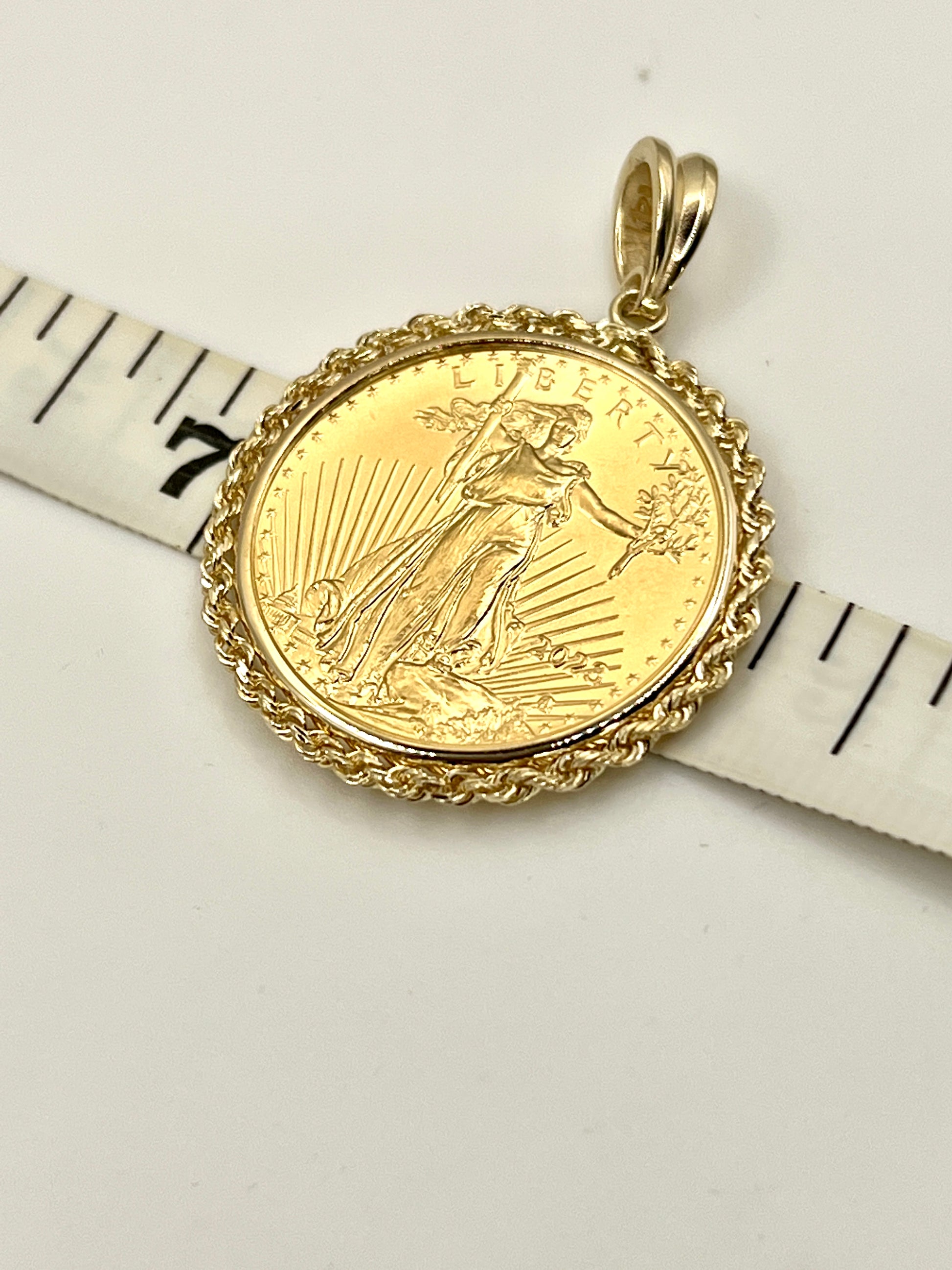 This listing is for a 22k gold 1/2 ounce American Eagle coin mounted in 14k gold four prong bezel. The bezel has a rope design. The total weight is approximately 21.8 grams. The American Eagle coin, which is highly sought after by collectors and investors alike, is known for its exquisite design and high-quality craftsmanship. Produced by the United States Mint, it is minted in various denominations.